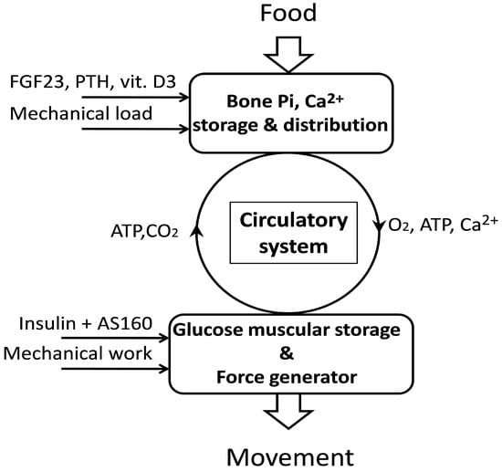 Systemic energy metabolism relies firstly on two main substrates: glucose and oxygen []. Cellular life is maintained by oxidative phosphorylation, which uses, on average, six molecules of oxygen per every molecule of glucose []. To satisfy these needs, under physiologic conditions, the oxygen and glucose extraction from blood should also be balanced []. Taken together, the vital function of the circulatory system is a continuous supply of balanced amounts of energy metabolites to all body cells to maintain homeostasis. Moreover, systemic energy control must also quickly respond to dynamic changes in energy consumption in skeletal muscles during physical activity. Therefore, the second vital role of energy metabolism control is to protect the brain from energy-fuel deficiency. The increased levels of energy consumption by the skeletal muscles cannot compromise brain functioning. The aim of maintaining a stable supply of energy fuels to the brain and the entire nervous system, as well as the heart and respiratory system, has emerged as avital task for energy metabolism control. Without any doubt, oxygen and glucose delivery to the brain, heart, and the muscles of the diaphragm is a priority for the control of energy production and distribution. The energy distribution to strategic organs is particularly challenging in the case of intensive physical activity when most of the energy fuel must be allocated to the activity of striatal muscles. To solve this energetic dilemma, the intake of glucose by the striatal muscle is mediated by ATP produced by the heart, muscle, and bone tissue. Systematic energy control monitored energy fuel distribution online and reorganized it according to the needs of the muscular system. The fundamental role in these processes seems to be played by the phosphate-calcium tandem [,].