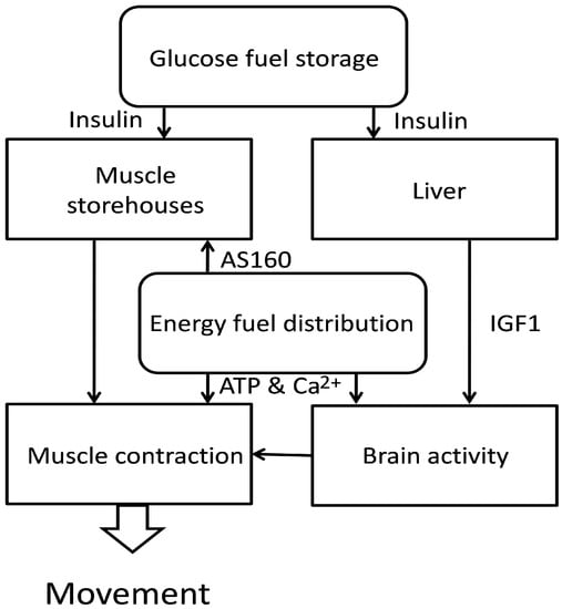 To maintain energy balance and sustain life, the operation of the energy quadriga consisting of oxygen, glucose, calcium, and phosphate, must be precisely coordinated. In this tandem, the primary controlling mechanism of glucose distribution and storage is based on the Akt substrate regulating glucose transporter (GLUT4) translocation (AS160). This substrate links insulin and insulin-like growth factor (IGF1) signaling and glucose uptake and storage in the muscles, liver, and adipose tissue [,]. The postprandial rise in blood glucose triggers the release of insulin, which controls the systemic targeted distribution and storage of glucose [,]. With active muscles being the main consumer of energy, they are also the largest autonomic stores of glucose [,]. In the process of energy metabolism, the AS160 phosphorylation operates as a metabolic valve that activates the glucose transporter GLUT4 both in skeletal muscle and adipocytes. The postprandial release of insulin results in almost a three-fold increase in AS160 phosphorylation. Additionally, physical activity intensifies AS160 phosphorylation in all active muscles and the heart []. Most importantly, efficient active muscles, and especially the heart, are the main source of ATP circulating in the blood, which synchronizes the activity of all tissues, including the brain. The age-related dysfunction of the AS160 phosphorylation valve limits muscle access to glucose and impairs its storage in the process of glycogenesis []. These seem to be the main pathomechanism of peripheral insulin resistance that disorganize muscle energy metabolism and physical activity. As a result of a growing energy deficit, motor activity in older adults declines gradually, leading to the development of osteoporosis and sarcopenia, both escalating muscle metabolic dysfunctions culminating in rhabdomyolysis [], which seems the final rescue trial when balancing life-sustaining energy metabolism.
