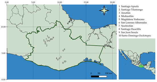 Locations of S. semiatrata populations in Oaxaca, Mexico, that were sampled for this study. Maps were generated using QGIS 3.28.1-Firenze.
