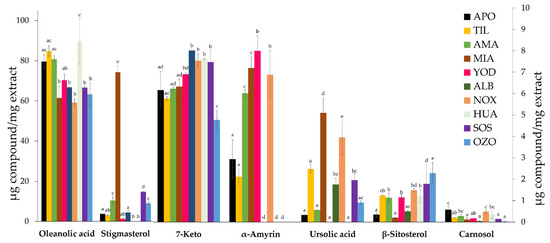 S. semiatrata terpenoid content from ten locations. The bars represent the mean ± standard deviation of three replicates. Oleanolic acid and stigmasterol contents are presented on the left Y-axis, and the other compounds are presented on the right Y-axis. For each location, values with different minuscule letters are significantly different, according to Tukey’s test p < 0.05.