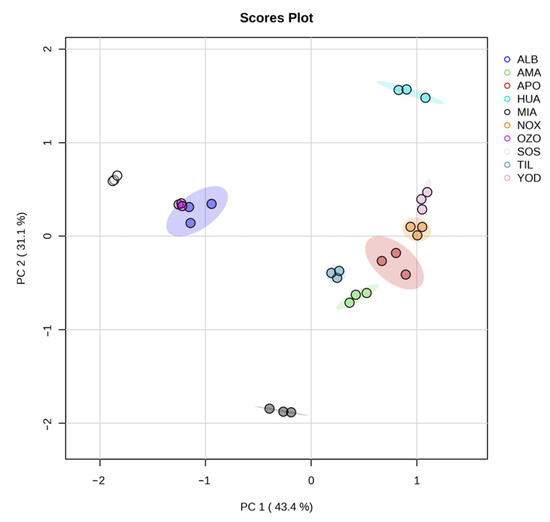 In the PCA of 10 compounds, the first 2 principal components were selected. The contribution of the eigenvalues of these two components was 74.5%. A 2D diagram was used to visualize the characteristics of the identified secondary metabolite content. PC1 mainly represented the content of ursolic acid, quercetin, and α-amyrin, which accounted for 43.4% of the variation, while PC2 mainly represented the content of oleanolic acid, quercetin, and ursolic acid, which accounted for 31.3% of the variation. Similar characteristics were found for the contents identified in Magdalena Yodocono, Nochixtlán, Santiago Apoala, Amatlán, and Santiago Tilantongo. On the other hand, the localities of San Lorenzo Albarradas, Ozolotepec, and San Juan Sosola also showed similarities, while Miahuatlán and Santiago Huauclilla were the most different concentrations (Figure 4).