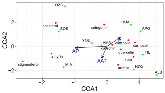 3.3. Canonical Correspondence Analysis (CCA) between Climatic Variables and Secondary Metabolite Content