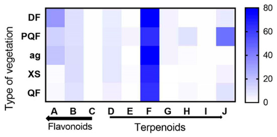 Heat map related to the concentrations of different terpenoids (D—7-keto, E—ursolic acid, F—oleanolic acid, G—α-amyrin, H—β-sitosterol, I—carnosol, J—stigmasterol) and flavonoids (A—quercetin, B—catechin, C—naringenin) in five different types of vegetation (DF—Deciduous Forest, QF—Quercus Forest, PQF—Pinus–Quercus Forest, Ag—Agriculture, XS—Xeric Scrub). Concentration levels (µg/mg) are indicated by the shift from blue to white, with dark blue indicating the highest values.