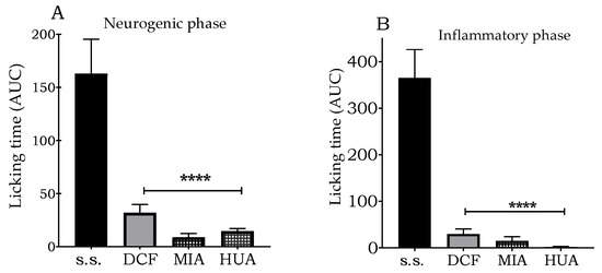 Antinociceptive effect of ethyl acetate extracts of S. semiatrata. Bars represent the mean ± standard error of six animals. Asterisks indicate significant differences with respect to vehicle, with ANADEVA performed in this analysis, followed by Dunnett’s test. Saline solution (s.s.), diclofenac (DCF), Miahuatlán (MIA), and Santiago Huauclilla (HUA). (A) Neurogenic phase; (B) Inflammatory phase **** p < 0.0001.