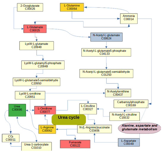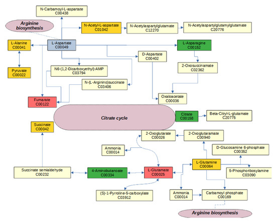 Each enriched pathway has a different overall set of differentially abundant metabolites, and some metabolites were annotated for multiple enriched pathways. Fumarate, which presented MIA and stress effects, is annotated with three interconnected pathways: arginine biosynthesis, alanine, aspartate and glutamate metabolism, and the citric cycle (Figure 1). Arginine biosynthesis and alanine, aspartate and glutamate metabolism pathways were enriched among other metabolites that exhibited MIA and stress effects. Within the arginine biosynthesis pathway, urea cycle metabolites had MIA and stress effects (Figure 1). The alanine, aspartate and glutamate metabolism pathway (Figure 2) and the butanoate metabolism pathway were overrepresented among metabolites presenting STR effects. These metabolic pathways are connected by glutamate and 4-aminobutanoate.