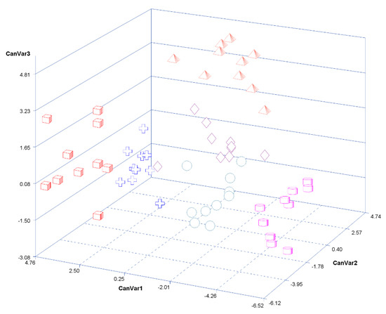 The 48 metabolites that presented significant (FDR-adjusted p-value < 0.05) effects of MIA, STR, or the interaction between MIA and STR were combined into three significant (p-value < 0.05) canonical variables. The metabolites metaglutamic acid, glycerol-3-P, glycine, inosine, lactamide, lactic acid, nicotinamide, O-phosphoethanolamine, and serine had the most extreme coefficients in the three significant canonical variables. The three significant canonical variables were able to differentiate the six combinations of MIA and STR (Figure 3). Pigs from PPRSV-exposed gilts were grouped according to the more extreme values of at least one of the three canonical variables. Fasted pigs had relatively high values for the first canonical variables for both PPRSV-exposed (red cubes) and control (blue crosses) gilts. Similarly, the Poly(I:C)-treated pigs had relatively low values for the first canonical variables for both PPRS (magenta cylinders) and control (teal circles) gilts. The saline pigs had intermediate values for the first canonical variable, with pigs from PPRS gilts (red pyramids) having relatively higher values for the third canonical variable than pigs from control (blue crosses) gilts.