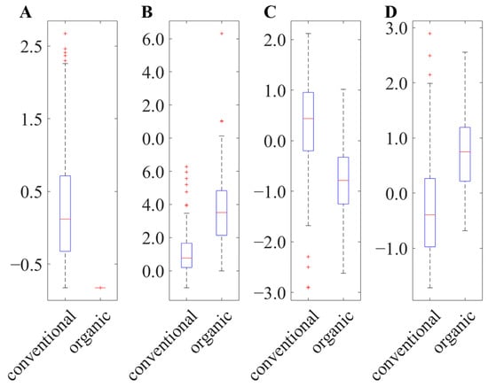 Boxplots of the normalized signal intensity of (A) canthaxanthin, (B) lutein/zeaxanthin, (C) TAG (18:1/16:1/16:1) and (D) TAG (18:3/18:2/18:1), which are chosen exemplary from the selected metabolites for the differentiation of conventional and organic eggs.