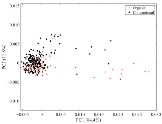 In order to analyze the main differences in the LC-MS data of the egg yolk, PCA was performed and the scores of the first two principal components, together representing 27.5% of the total variance, were depicted according to their husbandry (Figure 1). PC1 and PC2 combined represent only a small amount of the total variance of the data set. Nevertheless, for PCAs with LC-MS data and a high number of variables that are not correlated but independent, it often occurs that the PCs only show low variances [,,]. Only a few samples from conventional husbandry are located in the lower right corner of the scores plot and show no overlap with samples from organic husbandry. However, there is no clear separation between organic and conventional samples with the unsupervised approach PCA, which is why the supervised approach random forest was applied subsequently with all 1727 variables.