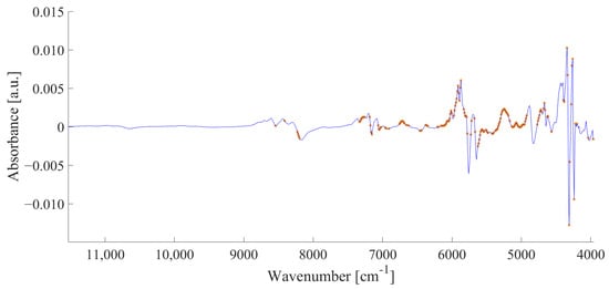 Variables from several regions of the spectrum associated with lipids were selected. Most of them were in the range between 5700 and 6000 cm−1, assigned to the first overtone of saturated and unsaturated fatty acids. Furthermore, variables in the ranges between 4000 and 4300 cm−1 and 8400 and 8600 cm−1 could be assigned to the first overtone of C-H vibrations and the second overtone of C-H stretching from unsaturated fatty acids, respectively, while the signals at 8300 cm−1 are associated with the second overtone of C-H stretching vibrations []. In addition, several variables were selected in the range between 6000 and 7300 cm−1. They could be assigned to the first overtone of the N-H and O-H vibrations of the peptide bond [].