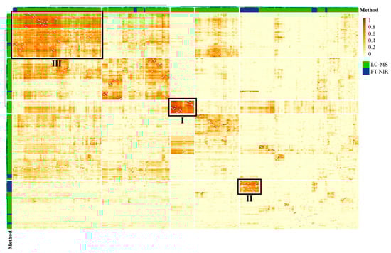 In the heatmap, different types of clusters are apparent. First, there is one cluster (Cluster I) that contains only LC-MS variables that have a high relation. This cluster contains all of the identified canthaxanthin variables. This is in accordance with a previous study using SMD for the analysis of LC-MS data, in which related variables could often either be assigned to the same metabolite (e.g., different adducts) or to metabolites with meaningful biological relations (e.g., metabolic pathways) []. Since this cluster only contains LC-MS variables, it can be concluded that carotenoids have only little impact on the FT-NIR spectra. This assumption is supported by other studies, in which the carotenoid content of passion fruit, corn, apricot and palm oil was investigated using NIR spectroscopy [,,,]. In these studies, the determination of the carotenoid content showed high error rates, which was explained by a low intensity of the absorption bands of carotenoids compared to the bands of the main ingredients [,].