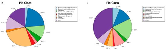 Pie charts of the main classes of metabolites identified by GC−MS (a) and LC−MS (b).