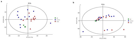Principal component analysis (PCA) model showed significant differences between the CNV and control groups: (a) PCA model of GC−MS analysis; (b) PCA model of LC−MS analysis. Red dots in the figure represent CNV cases (n = 11); blue spots represent controls (n = 11); green spots represent quality control (n = 3).
