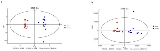 Orthogonal partial least-squares-discriminant analysis (OPLS−DA) model showed a significant difference between the CNV and control group: (a) OPLS-DA model of GC−MS analysis; (b) OPLS−DA model of LC−MS analysis. Red dots in the figure represent CNV cases (n = 11); blue spots represent controls (n = 11); green spots represent quality control (n = 3).