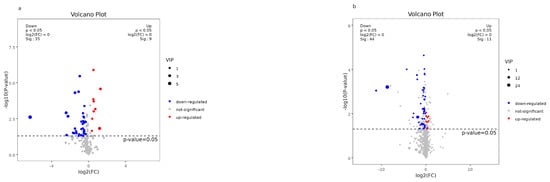 Volcano plots showing differential metabolites between groups from GC−MS (a) and LC−MS (b) analysis. Upregulated and downregulated metabolites are in red and blue, respectively. Nonsignificant metabolites are represented by gray dots.