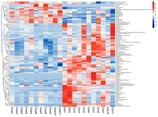 Heatmap showing relative peak areas of dysregulated metabolites in aqueous humor.