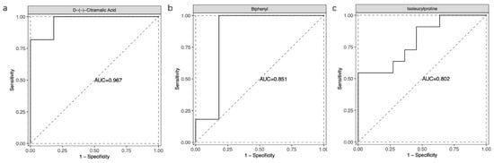 Sensitivity, specificity, and area under the curve values of potential disease-specific biomarkers.
