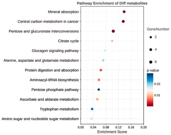 Metabolic pathway enrichment analysis identified 12 significantly enriched pathways. Among these pathways, five were related to carbohydrate metabolism, including pentose and glucuronate interconversions, citrate cycle (TCA cycle), amino sugar and nucleotide sugar metabolism, ascorbate and aldarate metabolism, and the pentose phosphate pathway. Two pathways were associated with amino acid metabolism, namely tryptophan metabolism and alanine, aspartate, and glutamate metabolism. The remaining five enriched pathways included central carbon metabolism in cancer, mineral absorption, the glucagon signaling pathway, protein digestion and absorption, and aminoacyl-tRNA biosynthesis (see Figure 7).