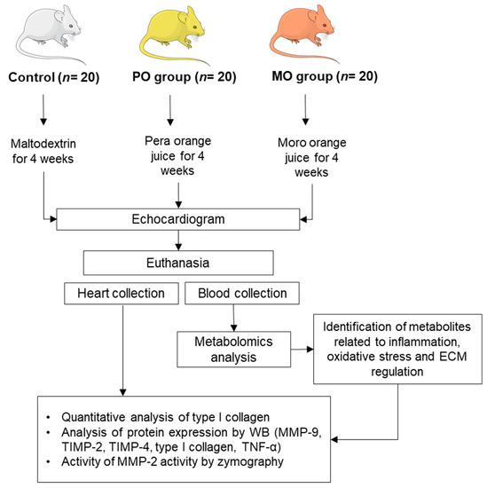 Flowchart of experimental protocol. PO: Pera orange juice; MO: Moro orange juice; ECM: extracellular matrix; WB: Western blot; MMP: matrix metalloproteinase, TIMP: tissue inhibitor of metalloproteinase.