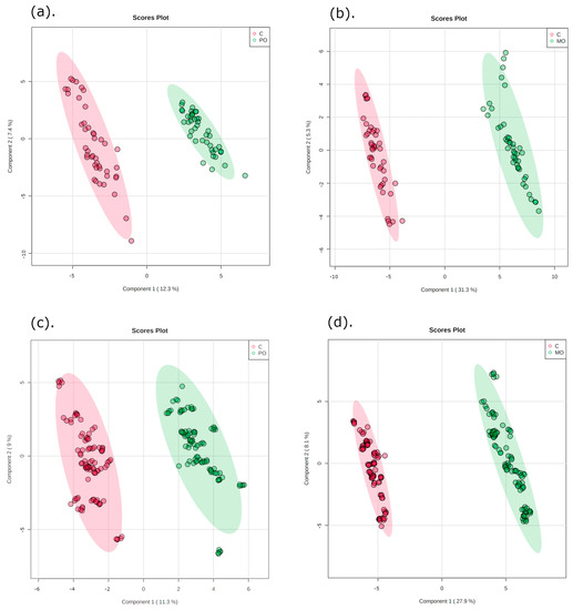 Partial least squares discriminant analysis (PLS-DA) of orange juice ingestion (green) and control groups (red) for two mass ranges. Graphics (a,b): m/z = 100–700; graphics (c,d): m/z = 700–1700. C: control; PO: Pera orange juice; MO: Moro orange juice.