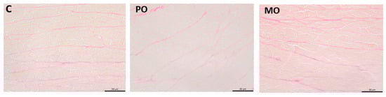 Myocardium was evaluated using picrosirius red-stained histological sections for quantitative collagen analysis. The percentage of collagen tissue did not differ between groups (C 2.33 ± 0.66; PO 2.53 ± 0.58; MO 2.50 ± 0.64%; p = 0.744; Figure 4).