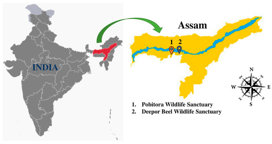 Different locations of two protected forest ecosystems of Assam, PWS (26°12″–26°16″ N and 91°58″–92°05″ E) and DBWS (26.1177° N and 91.6494° E), situated in the northeastern part of India, were selected for the collection of soil samples (Figure 1). The soil is mainly composed of river alluvium, and the color of the soil ranges from reddish-brown to reddish-yellow. The soil is termed fertile clayey loam with silt. The rhizosphere soil samples were taken from the upper layer and 10 to 20 cm beneath the earth’s surface. The samples were collected in sterile zip lock bags and properly labeled with the date of collection and brought to the laboratory on the same day and stored at 4 °C until examined.