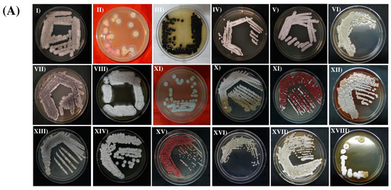 Isolation of actinomycetia from soil samples: (A) Pure culture plates of actinomycetia strains in GLM media. (I) Streptomyces sp. DBR11. (II) Streptomyces sp. PBR21. (III) Actinomadura sp. DBR17. (IV) Streptomyces sp. PBR30. (V) Streptomyces sp. DBR3. (VI) Streptomyces sp. PBR1. (VII); Streptomyces sp. DBR5. (VIII); Streptomyces sp. PBR11. (IX) Streptomyces sp. PBR19. (X) Streptomyces sp. PBR4. (XI) Streptomyces sp. DBR16. (XII) Streptomyces sp. PBR36. (XIII); Streptomyces sp. DBR1, (XIV); Streptomyces sp. PBR19, (XV) Streptomyces sp. DBR10. (XVI) Nonomuraea sp. DBR25. (XVII) Streptomyces sp. DBR4. (XVIII) Streptomyces sp. PBR35. (B) SEM image showing rectiflexibiles-type spore chains. (I) Streptomyces sp. DBR11. (II) Streptomyces sp. PBR1. (III) Streptomyces sp. PBR36.