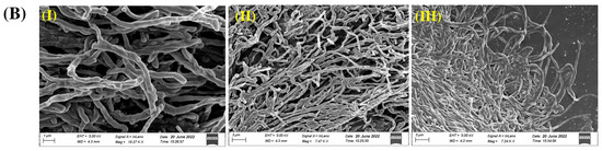 The plant rhizosphere is a hotspot for microbial interactions and activities and is widely being studied by scientists [63,64]. Actinomycetia are important soil microbes that dominate the rhizosphere and contribute to various ecological processes. However, despite their significance, only a small portion actinomycetia has been studied [65]. Assam, located in one of the world’s mega-biodiversity hotspots, is indeed home to diverse forest ecosystems that are considered poorly explored [7]. These forests of Assam harbor a wide range of microbial communities and are recognized as important resources of actinomycetia [7,66]. In the present study, a total of 65 morphologically diverse actinomycetia were isolated from two less explored forest ecosystems of Assam, namely PWS and DBWS. The morphological characterization of the 65 actinomycete isolates was assessed by analyzing various visible morphological characteristics. These characteristics included colony morphology, aerial and substrate mycelium color, and the presence of diffusible pigments. Thirteen isolates of Streptomyces produced a diffusible pigment, which is considered a key feature for the morphological characterization of the Streptomyces [67]. In addition to pigment production, other characteristics such as spore chain length, hyphae structure, and fragmentation of mycelium are also considered for the classification of actinomycetia [68]. The SEM analysis revealed that the aerial mycelia of Streptomyces sp. DBR11, Streptomyces sp. PBR1, and Streptomyces sp. PBR36 are long, straight, and branched with chains of conidiospores. The mycelium of all three actinomycetia is closed, compact, and rectiflexibiles type (Figure 3B).