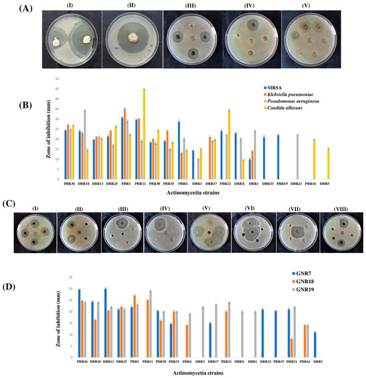 In vitro antimicrobial bioassay of actinomycetia extracts against model pathogens and MDR pathogens: (A) Antimicrobial activity by spot inoculation (I,II) and well diffusion method (III–V) against model pathogens: (I) Candida albicans (MTCC 227). (II,III) MRSA (ATCC 43300). (IV) Klebsiella pneumonia (MTCC 3384); (V) Pseudomonas aeruginosa (MTCC 741). (B) Bioactivity of fermentation broth of actinomycetia isolates against model pathogens, based on triplicate experiments. (C) Antimicrobial activity by well diffusion method against MDR pathogens: (I,II) Pseudomonas aeruginosa. (III–V) Enterococcus faecalis. (VI–VIII) Escherichia coli. (D) Bioactivity of fermentation broth of actinomycetia isolates against 3 MDR pathogens, based on triplicate experiments, against: GNR7; Enterococcus faecalis; GNR18; Pseudomonas aeruginosa; and GNR19; Escherichia coli.