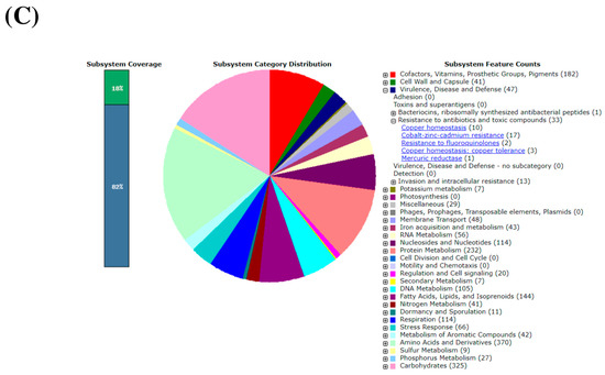 An overview of the subsystem category of the annotated whole genomes of three actinomycetia strains showing virulence or antibiotic resistance encoding genes using RAST pipeline: (A) Streptomyces sp. PBR36. (B) Streptomyces sp. PBR36. (C) Streptomyces sp. DBR11. Green color in the color bar represents features that are found in the RAST subsystem. The blue color represents features not assigned to a subsystem.