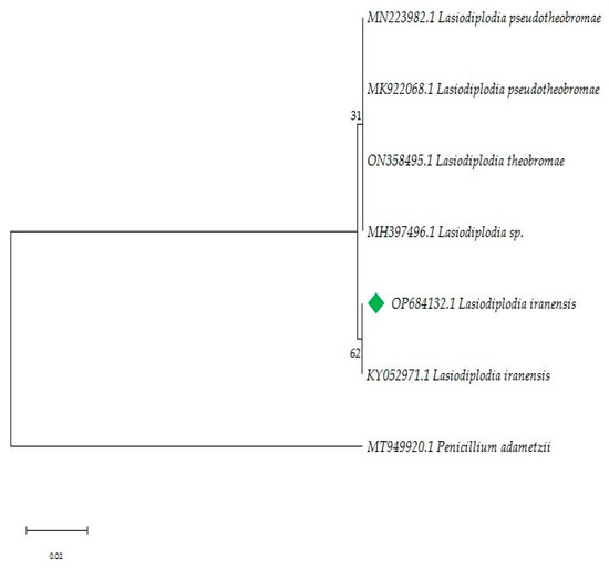 - Abdollahzadeh, J.; Javadi, A.; Goltapeh, E.M.; Zare, R.; Phillips, A.J.L. Phylogeny and Morphology of Four New Species of Lasiodiplodia from Iran. Persoonia Mol. Phylogeny Evol. Fungi 2010, 25, 1–10. [Google Scholar] [CrossRef]