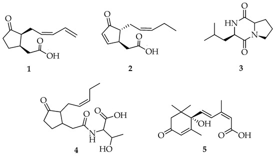 - Eng, F.; Marin, J.E.; Zienkiewicz, K.; Gutiérrez-Rojas, M.; Favela-Torres, E.; Feussner, I. Jasmonic Acid Biosynthesis by Fungi: Derivatives, First Evidence on Biochemical Pathways and Culture Conditions for Production. PeerJ 2021, 9, e10873. [Google Scholar] [CrossRef] [PubMed]