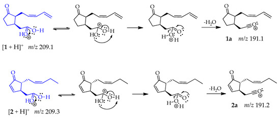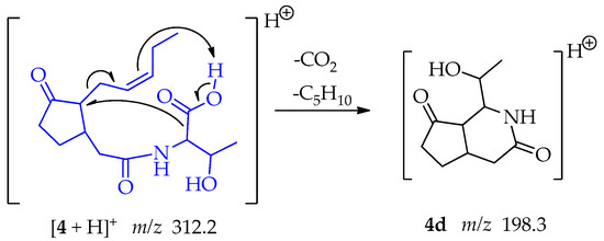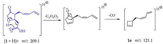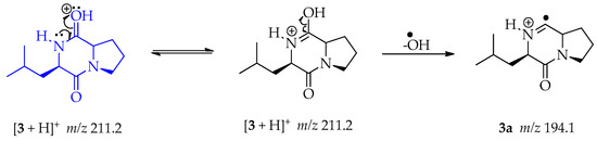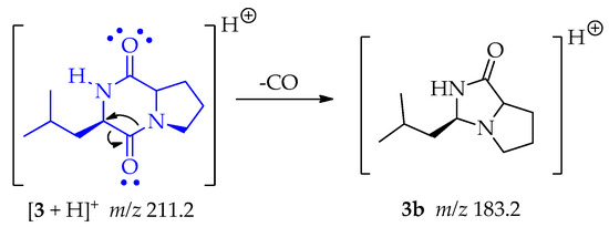 - Furtado, N.A.J.C.; Vessecchi, R.; Tomaz, J.C.; Galembeck, S.E.; Bastos, J.K.; Lopes, N.P.; Crotti, A.E.M. Fragmentation of Diketopiperazines from Aspergillus fumigatus by Electrospray Ionization Tandem Mass Spectrometry (ESI-MS/MS). J. Mass Spectrom. 2007, 42, 1279–1286. [Google Scholar] [CrossRef]
