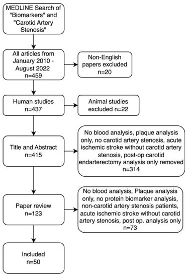 The MEDLINE database was searched for current research (January 2010–August 2022) evaluating the plasma/serum protein biomarkers, carotid plaque and adverse outcomes in patients with carotid artery stenosis in humans. The terms carotid artery stenosis and biomarkers were cross searched in the database with filters set to research past January 2010. Two researchers conducted the literature review independently in order to prevent missing articles.