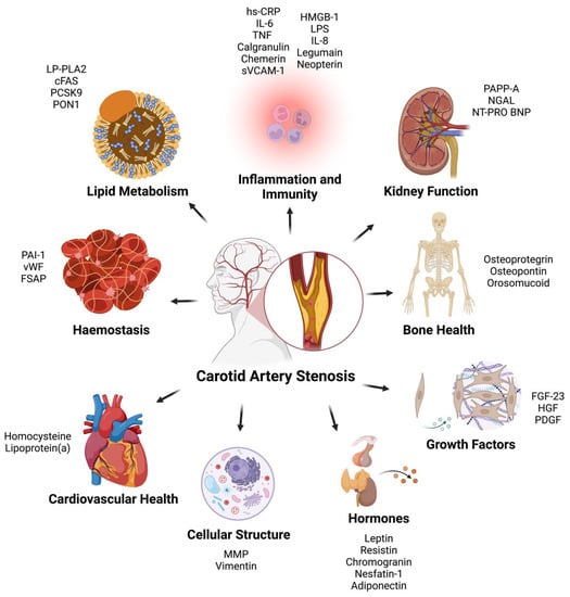 Carotid artery stenosis biomarkers categorized based on primary function. hs-CRP = High Sensitivity—C Reactive Protein; IL-6 = Interleukin-6; TNF = Tissue Necrosis Factor; sVCAM-1 = Soluble Vascular Cell Adhesion Molecule-1; HMGB-1 = High Mobility Group Box-1; LPS = Serum Lipopolysaccharide-Binding Protein; IL-8 = Interleukin-8; PAPP-A = Pregnancy-Associated Plasma Protein A; NGAL = Neutrophil Gelatinase Associated Lipocalin; NT-PRO BNP = N-Terminal Pro B-Type Natriuretic Peptide; FGF-23 = Fibroblast Growth Factor—23; HGF = Hepatocyte Growth Factor; PDGF; Platelet Derived Growth Factor; MMP = Matrix Metalloproteinases; PAI-1 = Plasminogen Activator Inhibitor-1; vWF = Von Willebrand Factor; FSAP = Factor VII Activating Protease; LP-PLA2 = Lipoprotein-Associated Phospholipase A2; cFAS = Circulating Fatty Acid Synthase; PCSK9 = Proprotein Convertase Subtilisin/Kexin Type 9; PON1 = Paraoxonase-1.
