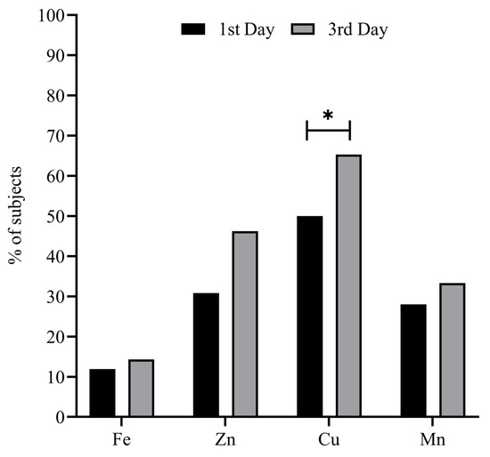 Percentage of subjects with mineral deficient status on the 1st and 3rd days of ICU stay. Chi Square test was used to compare the evolution of the mineral variables by % of deficient subjects. * Statistical significance = p < 0.05. Abbreviations: Cu = copper; Fe = iron; Mn = manganese; Zn = zinc.