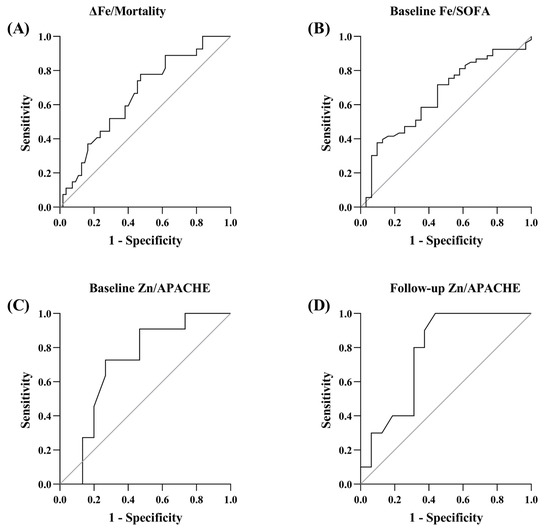 ROC curves of Fe and Zn as mortality and severity predictors. (A) ROC curve of changes in Fe predicting mortality. (B) ROC curve of Fe predicting SOFA at ICU admission. (C) ROC curve of Zn predicting APACHE at ICU admission. (D) ROC curve of Zn predicting SOFA on the 3rd day of ICU stay.
