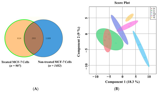 (A) A Venn diagram represents the relation between significantly dysregulated intracellular ions in treated MCF-7 with E. coli secretome (n = 907) and non-treated cells (n = 1482) at different time points (0, 1, 2, 6, 8, and 24 h). (B) Sample clustering and group separation. PLS-DA of 614 features of MCF-7 cells that were treated with E. coli secretome at different time points (0, 1, 2, 6, 8, and 24 h).