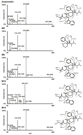 | Anamorelin (parent) | C31H42N6O3 | 16.41 | 547.3395 | 0.70 | 75, 91, 174, 202, 272, 276 | 5.9 × 109 | |