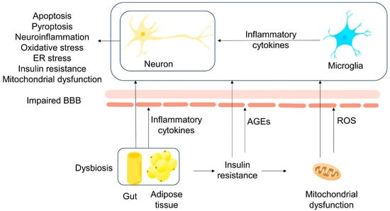Systemic inflammation plays a role in the pathogenesis of AD, and chronic low-grade systemic inflammation is the main feature of obesity. An experiment conducted on obese C57BL/6 mice fed on a high-fat diet confirmed that obesity in aging is associated with an increase in the systemic inflammatory status, which exacerbates the destruction of the BBB []. Research has demonstrated that adipose tissue can promote the secretion of some cytokines, such as tumor necrosis factor-α, interleukin-1β, interleukin-6, and chemokine (C-C motif) ligand 2, and thus recruit macrophages and lymphocytes []. Then, secreted tumor necrosis factor-α and interleukin-6 can reduce lipoprotein lipase activity, thereby increasing blood lipid levels []. It is worth noting that a high blood lipid level and a high-fat diet are associated with dysbiosis in the gut, and this can lead to impaired lipid metabolism []. Furthermore, these adipokines and cytokines are able to act together on distant organs, especially the brain, promoting the production of brain cytokines by activating endothelial and glial cells, particularly microglia [].