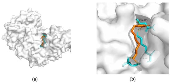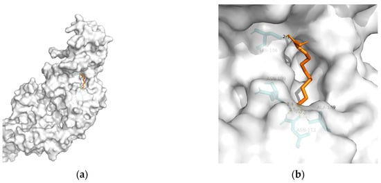 Docking results between 10-HDA and PPAR-α: (a) A gross view of the optimal conformation between PPAR-α and 10-HDA after molecular docking. (b) Details of the binding site be-tween PPAR-α and 10-HDA. Here, 10-HDA is represented as orange sticks, while PPAR-α is represented as a grey surface. And amino acid residues are represented as blue sticks, while hydrogen bonds are represented as dashed yellow sticks. Six hydrogen bonds are shown in the image, and 10-HDA is rooted in the binding pocket of PPAR-α.