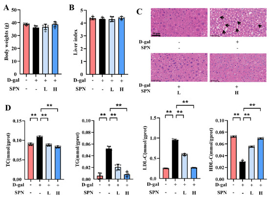 After 12 weeks of treatment, there were no significant differences in body weight or liver index among the groups (Figure 1A,B). However, lobular inflammation and focal necrosis were observed in the histopathology of the liver in the MOD group (Figure 1C). SPN treatment could attenuate these injuries in the D-gal–induced liver. Furthermore, the hepatic lipid accumulation was examined by measuring TC, TG, LDL-C, and HDL-C in the liver (Figure 1D). TC, TG, and LDL-C contents in the MOD group increased compared with the control group (p < 0.01), and the content of HDL-C in the MOD group decreased (p < 0.01). SPN treatments decreased the levels of TC (p < 0.01), TG (p < 0.01), and LDL-C (p < 0.01) but increased the HDL-C contents in the D-gal–induced mice (p < 0.01), indicating that SPN could decrease hepatic lipid accumulation in D-gal–induced mice.