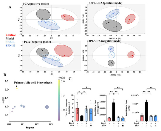 Specnuezhenide (SPN) regulated the metabolic profile and bile acid (BA) compositions. (A) The plot depicts separation of the principal component analysis (PCA) and orthogonal partial least-squares discriminant analysis (OPLS−DA) of serum from different groups at positive and negative modes. (B) Metabolic pathway analysis of identified potential marker. (C) Untargeted metabolomic analyses of serum, liver, and feces were performed to measure the concentration of total BAs (n = 5). Data are expressed as mean ± SD. * p < 0.05, ** p < 0.01 compared with the model (MOD) group.
