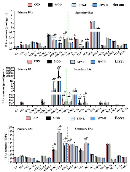 BAs were quantified on the basis of the respective standard curves (Table S3). The total BAs decreased in the serum of the MOD group compared with the CON group (Figure 2C, p < 0.05). SPN treatment increased the total BAs in the serum of the D-gal mice (p < 0.05). Levels of total BAs in the liver and feces were also reduced in the MOD group (p < 0.01). SPN treatment increased the total BAs in the liver of the D-gal mice (p < 0.01). Compared with the MOD group, more BAs were excreted through the feces in the SPN-treated mice (p < 0.01).
