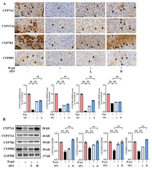 Specnuezhenide (SPN) upregulates the protein expression of bile acid (BA) enzymes in D−galactose (D−gal) mice. (A) Immunohistochemistry (IHC) analysis of cytochrome P4507A1 (CYP7A1), cytochrome P45027A1 (CYP27A1), cytochrome P4507B1 (CYP7B1), and cytochrome P4508B1 (CYP8B1) in the liver (black arrows, n = 5). (B) The levels of CYP7A1, CYP27A1, CYP7B1, and CYP8B1 were analyzed using western blotting. The densitometric quantification of CYP7A1, CYP27A1, CYP7B1, and CYP8B1 is shown in the right panels (n = 3). Data are expressed as mean ± SD. ** p < 0.01 compared with the model (MOD) group.