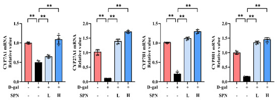 Since primary BA synthesis occurs in the liver, we examined the effect of SPN on the hepatic enzymes for bile acid synthesis, including CYP7A1, CYP7B1, CYP8B1, and CYP27A1. IHC results showed that the protein levels of CYP7A1 (Figure 4A, p < 0.01), CYP7B1 (p < 0.01), CYP8B1 (p < 0.01), and CYP27A1 (p < 0.01) were downregulated in the MOD group compared to the CON group, while SPN treatment restored these changes (p < 0.01). The expressions of CYP7A1, CYP7B1, CYP8B1, and CYP27A1 in the liver were also analyzed using western blotting (Figure 4B) and RT-PCR (Figure 5). The levels of these enzymes decreased in the MOD group compared with the CON group (p < 0.01), which was consistent with a previous report [19]. Importantly, the expression levels of CYP7A1 (p < 0.01), CYP7B1 (p < 0.01), CYP8B1 (p < 0.01), and CYP27A1 (p < 0.01) in the D-gal–induced livers were reversed in response to the SPN treatment. The above results suggested that SPN activated both the classical and alternative pathways of BA synthesis.