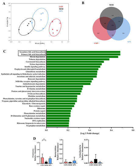 Given the critical crosstalk between the gut microbiota and BA metabolism, 16S rDNA high-throughput sequencing of the feces was used to evaluate the effect of SPN on gut microbiota. The Bray–Curtis PCoA revealed a total separation between the bacterial profiles of the CON, MOD, and SPN-H groups (Figure 6A). These groups shared 794 common OTUs (Figure 6B). Among the predicted functional metabolic pathways (Figure 6C), secondary BA biosynthesis and primary BA biosynthesis were affected by gut microbiota.