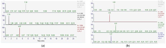 Final optimized methods. (a) Positive mode: dodecanedioic acid, isobutyryl-L-carnitine, and 12-aminolauric acid. (b) Negative mode: dodecanedioic acid, 12-aminolauric acid, 1,11-undecanedicarboxylic acid, and 10-hydroxy-2-decenoic acid.