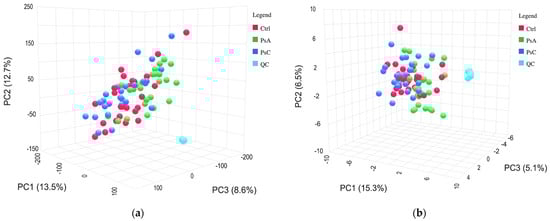 Principal component analysis of pooled QCs, represented by turquoise, and three patient groups—healthy volunteers (Ctrl), patients with psoriatic arthritis (PsA), and patients with psoriasis (PsC), represented by red, green, and dark blue on the plot, respectively. (a) Positive mode acquisition. PCA—PC1: 13.5%, PC2: 12.7%, and PC3: 8.6%. (b) Negative mode acquisition. PCA—PC1: 15.3%, PC2: 6.5%, and PC3: 5.1%.