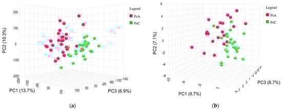 Principal component analysis of patients with psoriatic arthritis (PsA) and patients with psoriasis (PsC), represented by red and green on the plot, respectively. (a) Positive mode acquisition. PCA—PC1: 13.7%, PC2: 10.3%, and PC3: 6.9%. (b) Negative mode acquisition. PCA—PC1: 9.7%, PC2: 7.1%, and PC3: 6.7%.