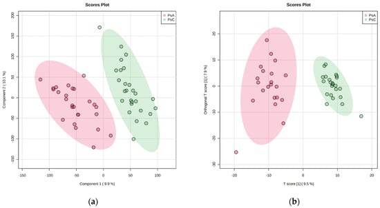 Discriminant analysis of patients with psoriatic arthritis (PsA) and patients with psoriasis (PsC), represented by red and green on the plot, respectively. (a) Partial least squares discriminant analysis (PLS-DA) of positive mode acquisition data. The model fits the acceptable criteria of 0.89 (R2) and 0.77 (Q2). (b) Orthogonal projections to latent structures discriminant analysis (OPLS-DA) of negative mode acquisition data. The model fits the acceptable criteria of 0.77 (R2) and 0.61 (Q2).